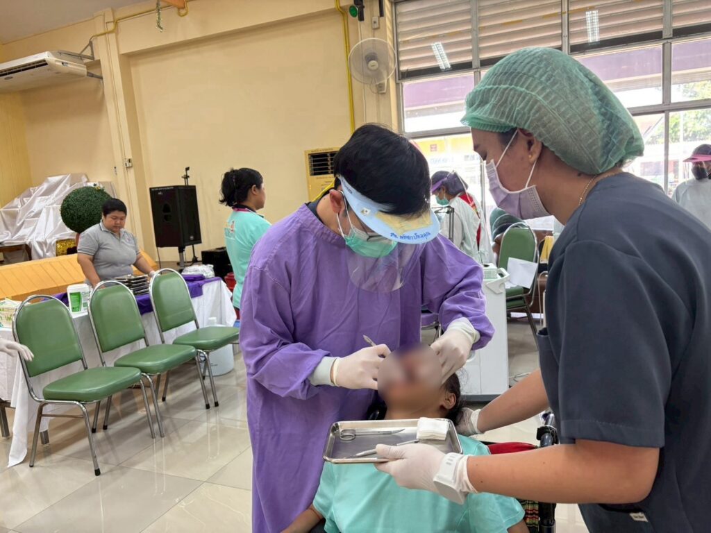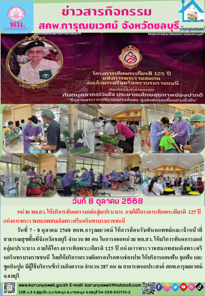 วันที่ 7 – 8 ตุลาคม 2568 นางสาวสุกัญญา บัวจันทร์ ผู้ปกครองสถานคุ้มครองและพัฒนาคนพิการการุณยเวศม์ ให้การต้อนรับทันตแพทย์และเจ้าหน้าที่สาธารณสุขพื้นที่จังหวัดชลบุรี จำนวน 80 คน ในการออกหน่วยแพทย์เคลื่อนที่ พอ.สว. ให้บริการทันตกรรมแก่กลุ่มเปราะบาง ภายใต้โครงการเทิดพระเกียรติ 125 ปี แห่งการพระราชสมภพสมเด็จพระศรีนครินทราบรมราชชนนี