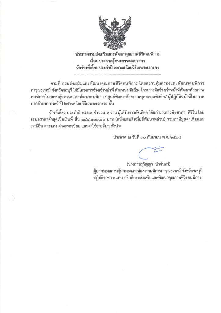 ประกาศผู้ชนะการเสนอราคา จัดจ้างพี่เลี้ยง (นางสาวพิชชาภา ศิริรื่น) ประจำปี ๒๕๖๙ โดยวิธีเฉพาะเจาะจง